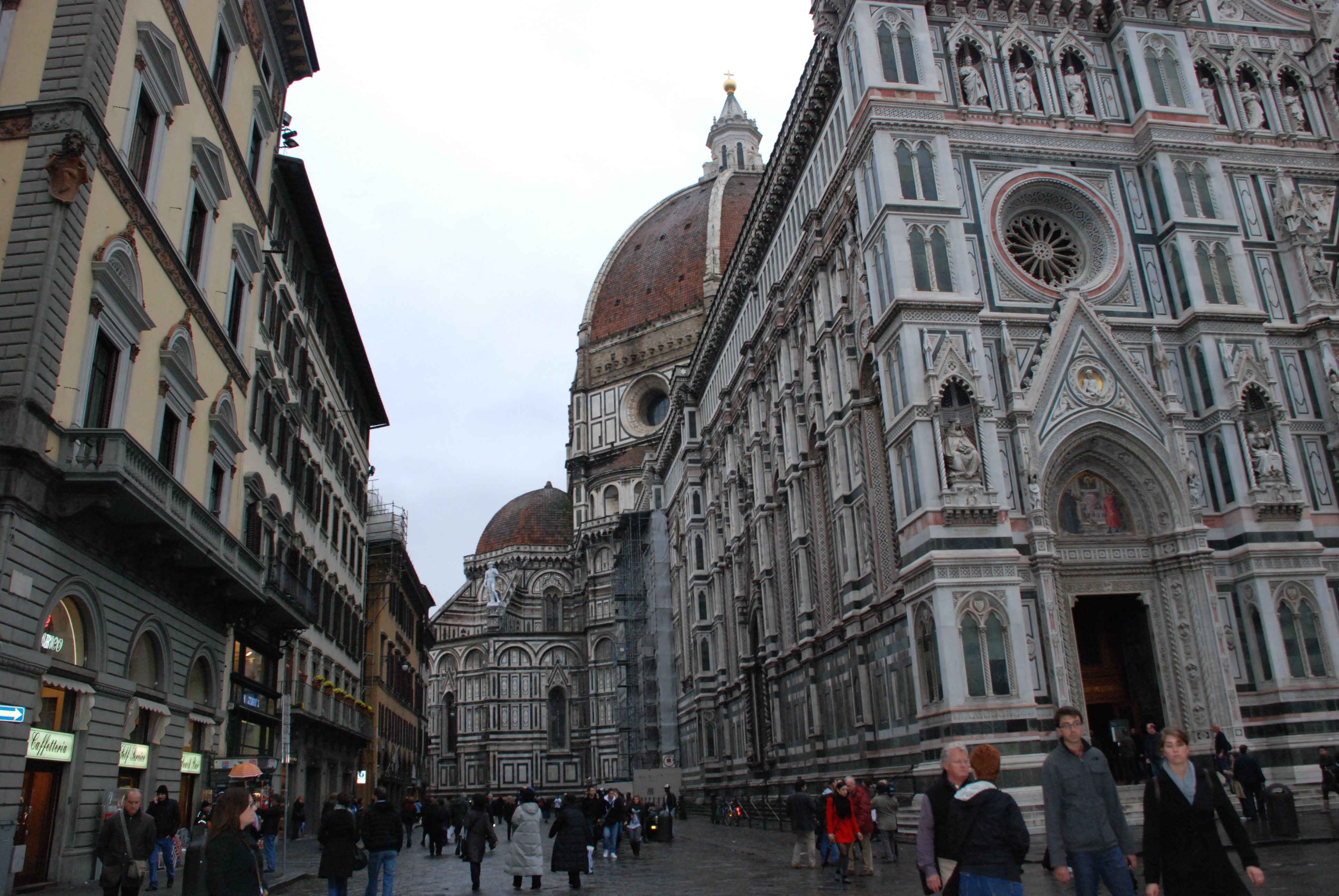 Duomo: Duomo is the italian word for the main cathedral in any city (a cathedral is a church with a Bishop), the actual name for the Duomo in Florence is Basilica di Santa Maria del Fiore, but everyone calls it the Duomo. Famous for it’s dome, designed by Brunelleschi and was a HUGE architectural feat, engineered and built many years after the basilica itself was. Largest brick dome ever constructed. Check out the golden doors on the Baptistery of St. John (the octagonal building in front of the Duomo). These were designed by Ghiberti, who won a contest to design them.